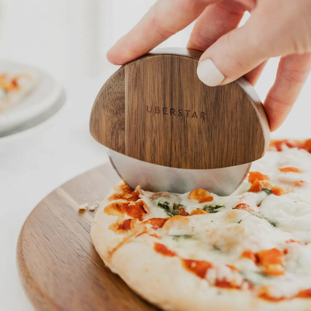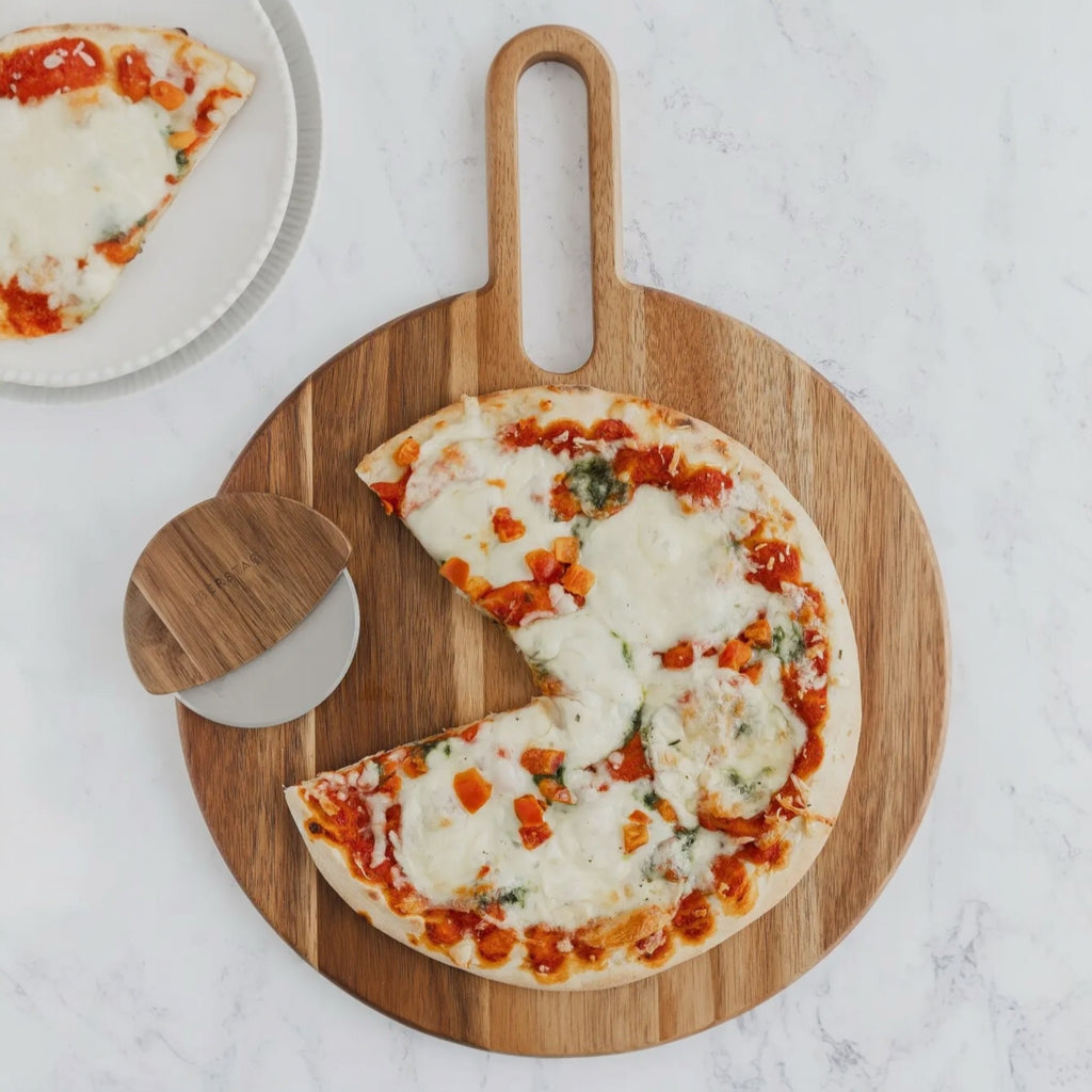Upgrade your pizza night with this sleek and stylish acacia wood board. Each board features a hollowed handle for a modern edge and ease of hanging. The set includes a matching pizza cutter that sits comfortably in your hand for smooth slicing.